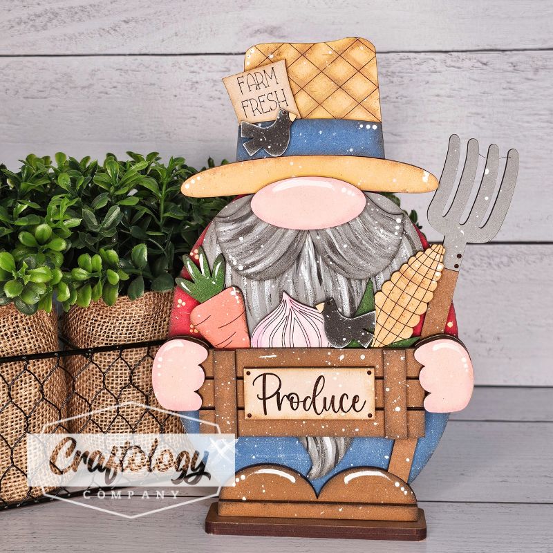 Gnome measures approximately 8"h x 5"w and is made from 1/8" MDF. 3D pieces are made with peel and stick adhesive on the backs for easy, no mess assembly. No glue required.